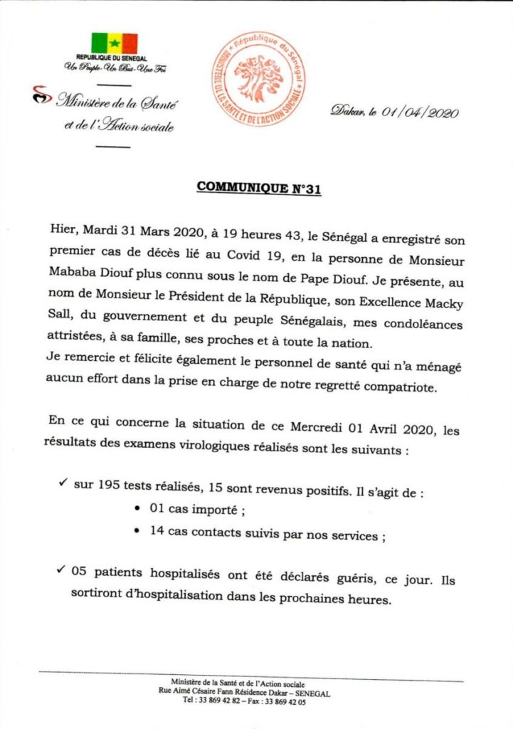 Le ministère de la Santé et de l’Action sociale, via son porte-parole, Dr Aloyse Waly Diouf, a déclaré ce 1er avril sur 195 tests effectués, 15 sont revenus positifs dont un cas importé et 12 cas contacts suivis par les services du ministère. Il a aussi noté que 5 patients hospitalisés ont été contrôles négatifs et sont donc déclarés guéris.