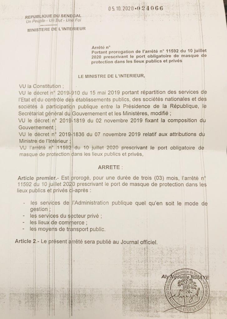 Dans le cadre de la lutte contre le coronavirus, le ministre de l’Intérieur a prorogé le décret de port de masque de trois mois. Pour Aly Ngouille Ndiaye, malgré la baisse du nombre de malades, la lutte continue.