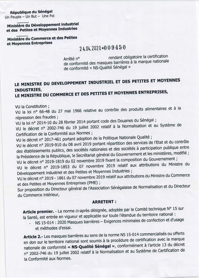 Me El Hadj Omar Youm, ministres sénégalais en charge des Transports et du Désenclavement, et son homologue, Assome Diatta en charge du Développement industriel et du Commerce ont pris, vendredi, 25 avril 2020, l’arrêté n°9450 du 24 avril 2020, rendant obligatoire la certification de conformité des masques barrières à la marque nationale de conformité (NS Qualité-Sénégal). Une manière pour les autorités de mettre de l’ordre dans la production de ces outils de protection. Depuis que leur port a été exigé, on en voit de toutes les couleurs.