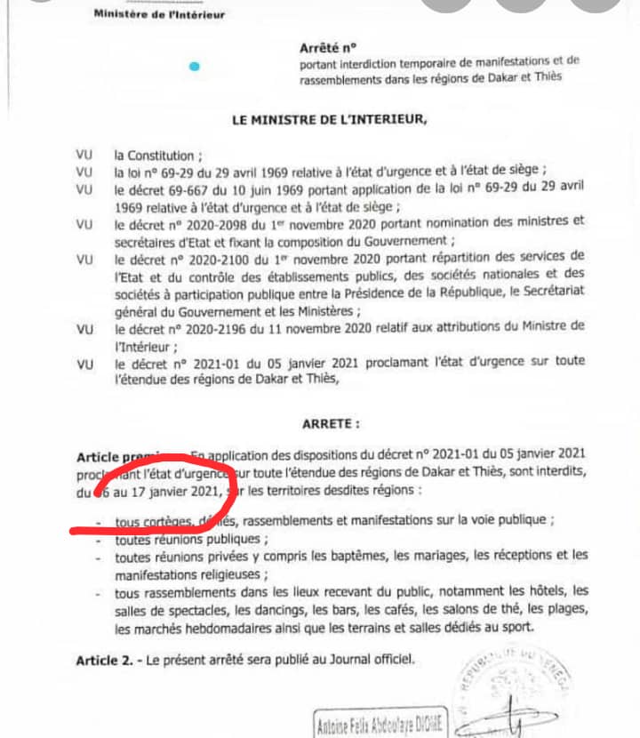 Ce soir sur la Rts, le ministre de l’Intérieur, Antoine Félix Abdoulaye Diome, a affirmé que le couvre-feu continuaient sur Dakar et Thiès de 21 heures à 5 heures du matin. Il soutient que le couvre-feu se terminait demain.