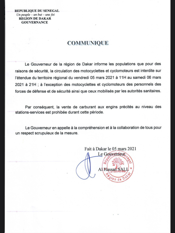 Actualités Société Dakar : La circulation des motocyclettes et cyclomoteurs interdite du vendredi au samedi (document) 5 mars 20215 mars 2021 jotalixibar Partager l'article Partager : Cliquer pour partager sur X(ouvre dans une nouvelle fenêtre) X Cliquez pour partager sur Facebook(ouvre dans une nouvelle fenêtre) Facebook Cliquez pour partager sur WhatsApp(ouvre dans une nouvelle fenêtre) WhatsApp Share Facebook Twitter Pinterest Linkedin