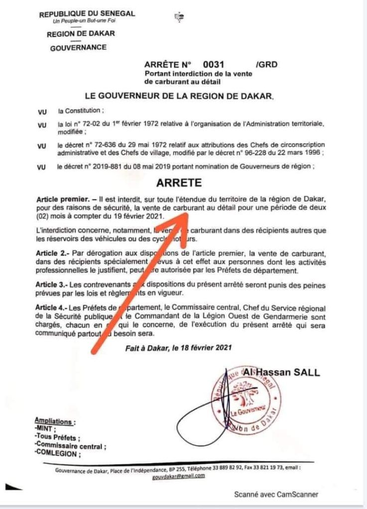 « Il est interdit, sur toute l’étendue du territoire de la région de Dakar, pour des raisons de sécurité, la vente de carburant au détail pour une période de deux (02) mois à compter du 19 février 2021 », selon un arrêté signé le gouverneur de Dakar, Al Hassane Sall, ajoutant que « l’interdiction concerne, notamment, la vente de carburant dans des récipients autres que les réservoirs des véhicules ou des cyclomoteurs ». Il prévient que les contrevenants aux dispositions du présent arrêté seront punis des peines prévues par les lois et règlements en vigueur.