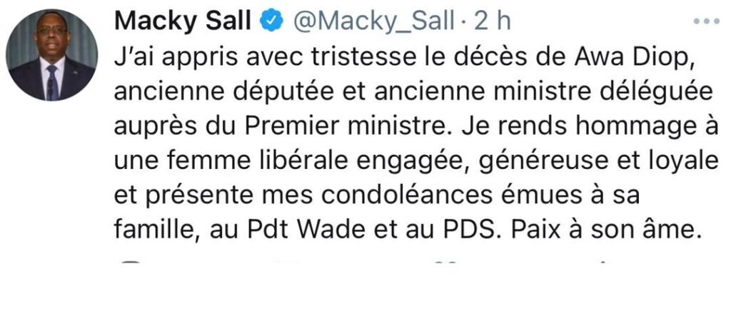 Sur le fil de sa page twitter, le président Macky Sall a dit toute sa tristesse à la suite du rappel à Dieu hier de son ex camarade de Parti, Awa Diop dont il a loué les qualités et rendu hommage.