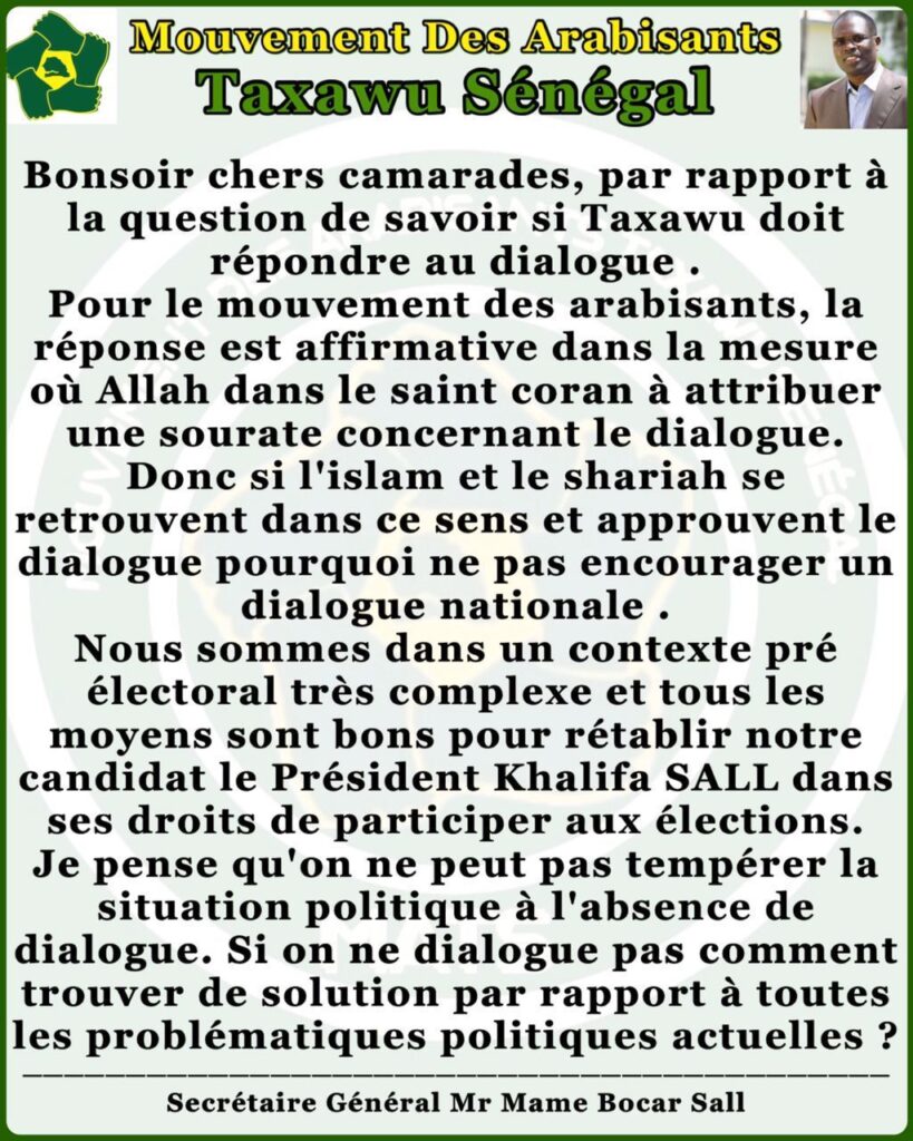 la coalition Taxaw Sénégal va participer au dialogue annoncé par le chef de l’État, ont déclaré les arabisants de ladite entité politique estimant que c’est même une recommandation coranique que de participer au dialogue pour aboutir à des solutions.