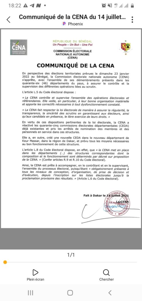 En perspective des élections territoriales prévues le dimanche 23 janvier 2022 au Sénégal, la Commission électorale nationale autonome (CENA) s’apprête, avec l’ensemble de ses démembrements présents dans les quarante-six (46) départements du pays, à assurer le contrôle et la supervision des différentes opérations liées au scrutin.