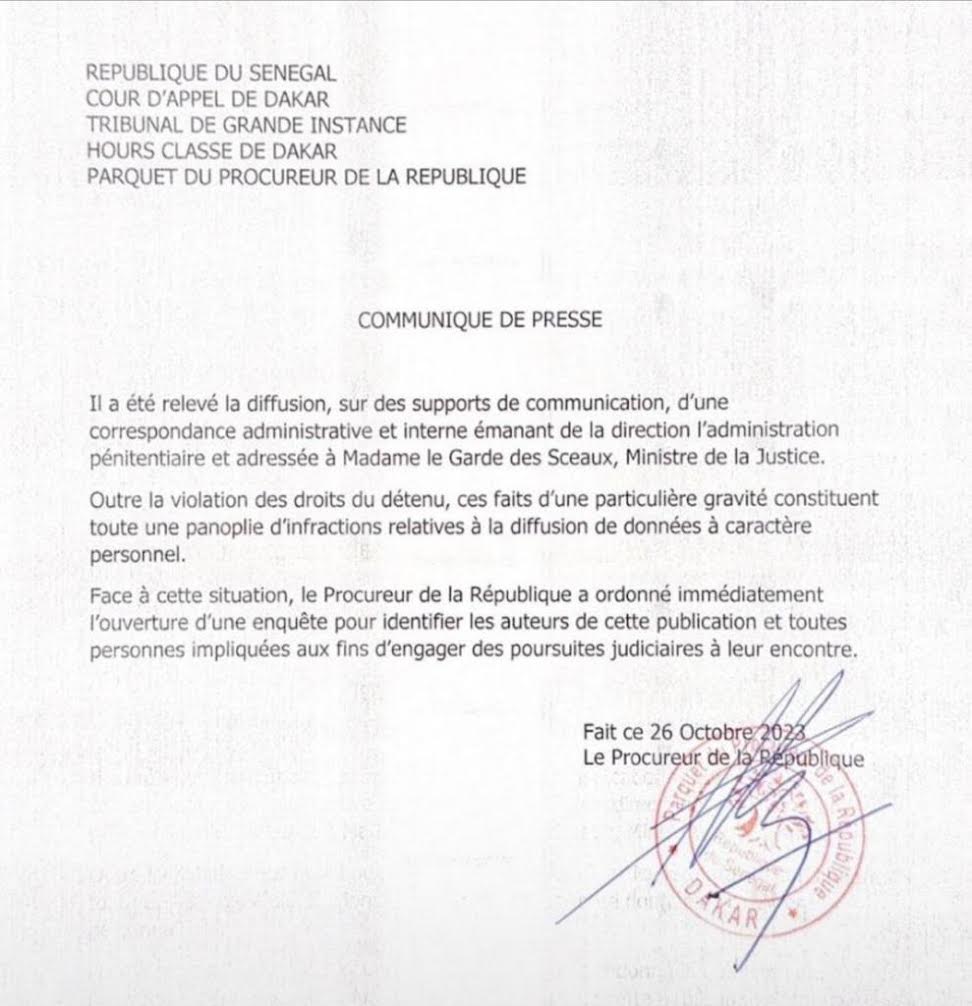 Le parquet de Dakar, dans un communiqué, déclare avoir ouvert une enquête pour identifier les auteurs de la fuite d’une correspondance administrative adressée par le directeur général de l’administration pénitentiaire à la ministre de la Justice, concernant l’état de santé de Ousmane Sonko.