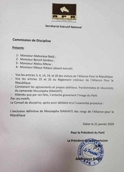Moustapha Diakhaté n’est plus membre de l’Alliance pour la République (APR). Dans un communiqué, il est indiqué que l’ancien ministre conseiller est “définitivement exclu des rangs de l’Apr”. par la commission de discipline dudit parti.