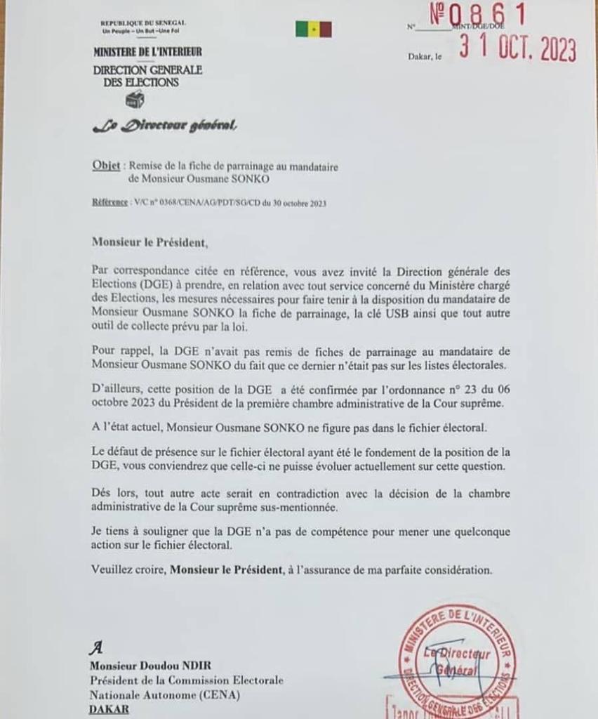 « Par correspondance citée en référence, vous avez invité la Direction générale des Elections (DGE) à prendre, en relation avec tout service concerné du Ministère chargé des Elections, les mesures nécessaires pour faire tenir à la disposition du mandataire de Monsieur Ousmane SONKO la fiche de parrainage, la clé USB ainsi que tout autre outil de collecte prévu par la loi. Pour rappel, la DGE n’avait pas remis de fiches de parrainage au mandataire de Monsieur Ousmane SONKO du fait que ce dernier n’était pas sur les listes électorale.