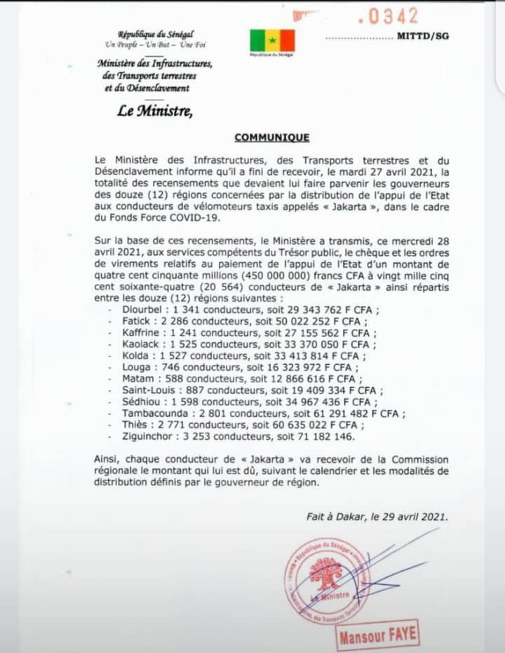 Les conducteurs de moto Jakarta vont se partager la somme de 450 millions Fcfa, dans le cadre du fonds Force covid-19. Le président Macky Sall avait octroyé cette somme pour remettre à flot ce secteur regroupant 20 564 conducteurs de motos «Jakarta» de 12 régions concernés sans Dakar et Kédougou, très impacté aussi par la crise sanitaire. Selon le journal Rewmi qui est entré dans les détails du calcul, chaque conducteur de moto Jakarta percevra 21 880 Fcfa.