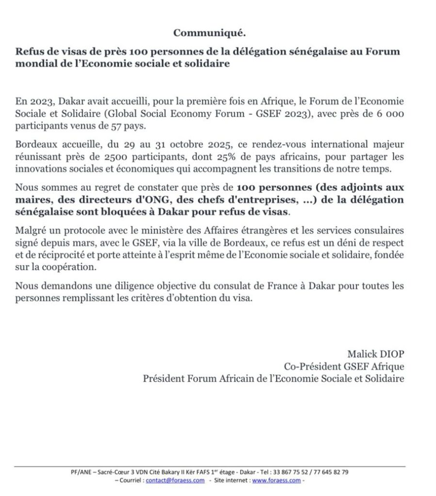 Actualités Société Forum mondial de l’économie solidaire à Bordeaux : 100 personnes bloquées à Dakar 23 octobre 202523 octobre 2025 Jotali_Xibar Partager l'article Partager : Cliquer pour partager sur X(ouvre dans une nouvelle fenêtre) X Cliquez pour partager sur Facebook(ouvre dans une nouvelle fenêtre) Facebook Cliquez pour partager sur WhatsApp(ouvre dans une nouvelle fenêtre) WhatsApp Share Facebook Twitter Pinterest Linkedin