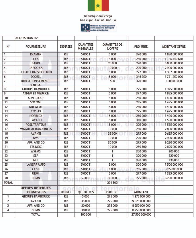 Mansour Faye, Le ministre du Développement communautaire, de l’Equité sociale et Territoriale, a rendu public le Tableau des tarifs proposés par les fournisseurs de riz qui ont soumissionné pour la commande de l’Etat dans la lutte contre la pandémie du covid-19.
