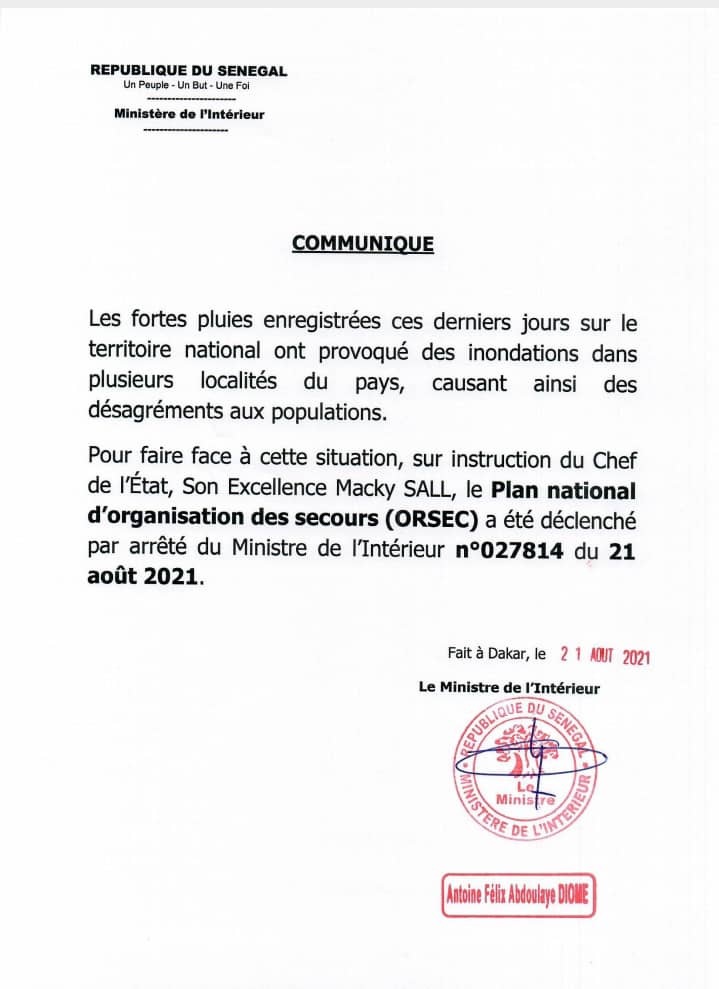 Actualités Société Inondations : Macky Sall déclenche le plan Orsec 21 août 202121 août 2021 jotalixibar Partager l'article Pour faire face aux inondations le chef de l’État a déclenché le plan Orsec. Partager : Cliquer pour partager sur X(ouvre dans une nouvelle fenêtre) X Cliquez pour partager sur Facebook(ouvre dans une nouvelle fenêtre) Facebook Cliquez pour partager sur WhatsApp(ouvre dans une nouvelle fenêtre) WhatsApp Share Facebook Twitter Pinterest Linkedin