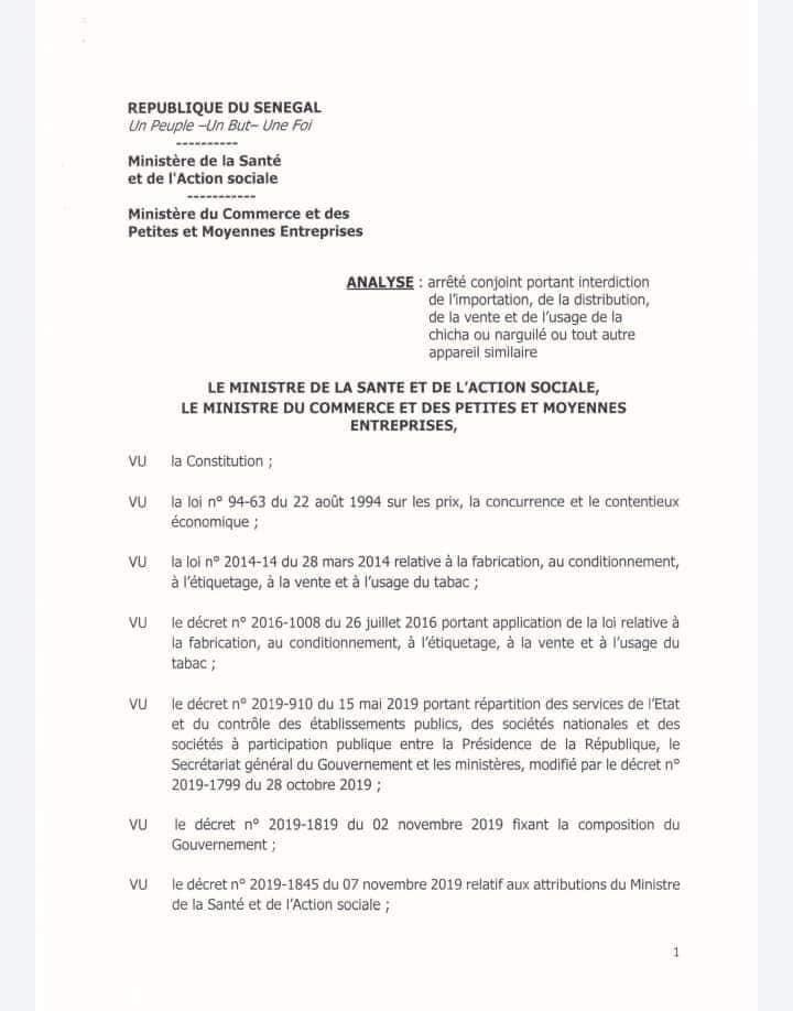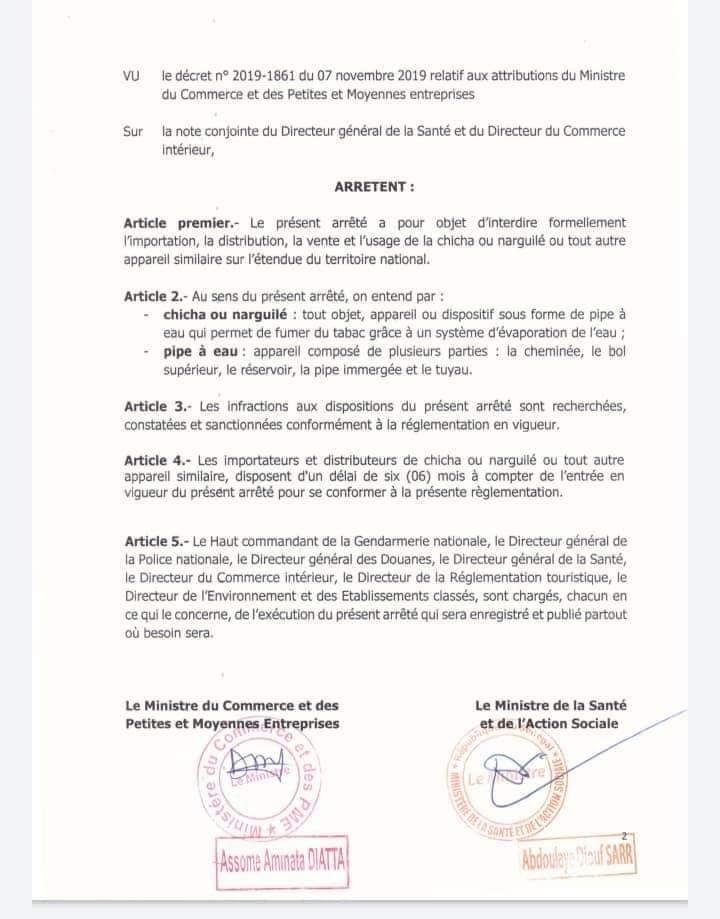 Un arrêté ministériel conjoint des ministères de la Santé et celui du Commerce interdit « formellement l’importation, la distribution, la vente et l’usage de la chicha ou narguilé ou tout autre appareil similaire sur l’étendue du territoire national ».