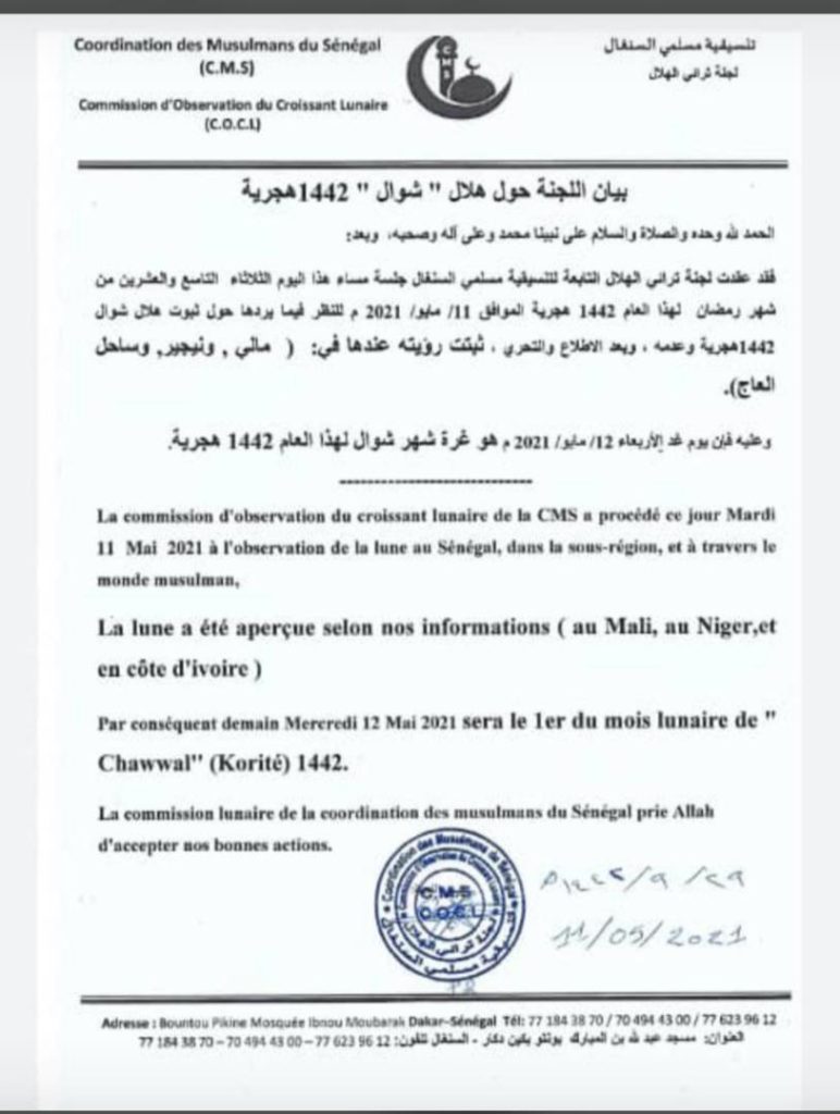 La coordination des musulmans du Sénégal déclare avoir vu la lune au Mali, au Niger et en Côte d’ivoire, entre autres pays. Dans u n communiqué, elle souligne que la fête de Korité sera donc célébrée demain mercredi 12 mai pour cette partie de la communauté musulmane. L’autre partie attendra jeudi 13 mai.