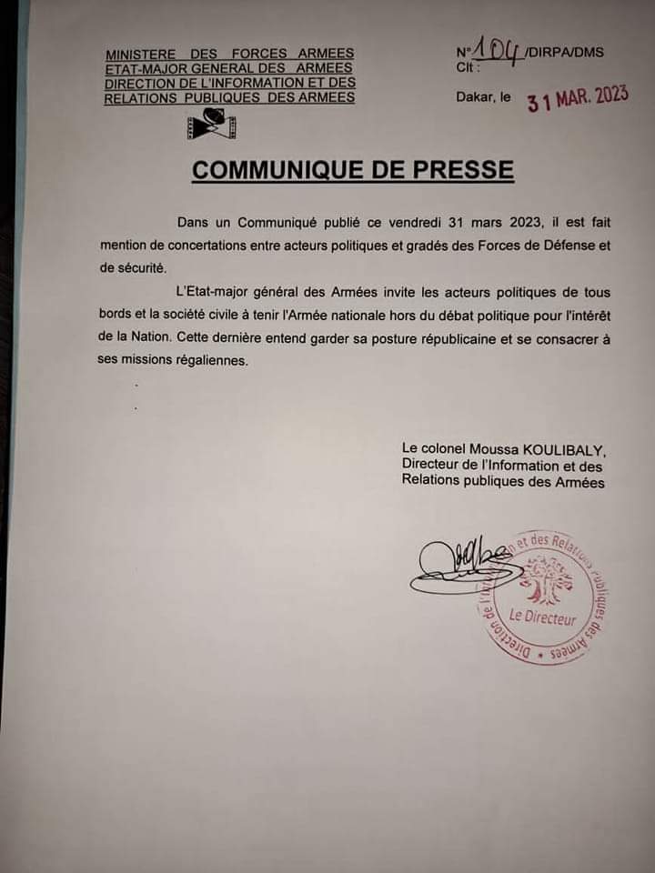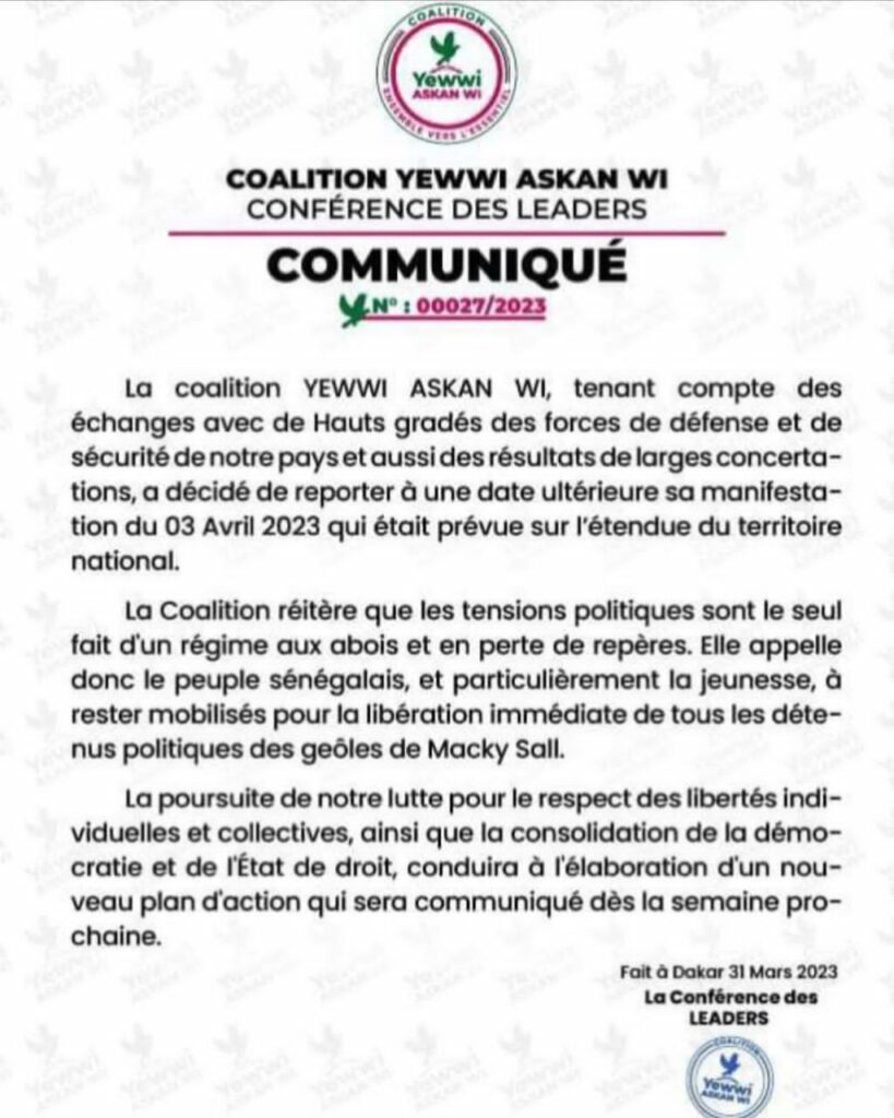 Le texte répond aux leaders de Yewwi qui ont mêlé son nom dans le cadre du report de sa manifestation qui était prévue le 3 avril prochain. Dans un communiqué, la conférence des leaders de Yewwi a déclaré que c’est après des concertations avec de hauts gradés de l’Armée qu’elle a décidé de reporter son activité.
