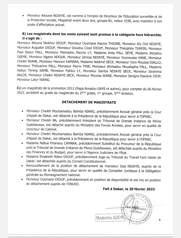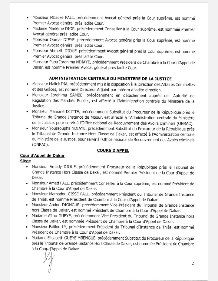 Amady Diouf est le nouveau Premier président de la Cour d’appel de Dakar. Il est remplacé au poste de Procureur de la République par Monsieur Abdou Karim DIOP, précédemment Procureur de la République Adjoint près le Tribunal de Grande Instance hors classe de Dakar. Ce dernier est, à présent, le Procureur de la République près le Tribunal de Grande Instance hors classe de Dakar.