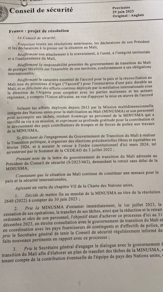 À la demande de Bamako, le Conseil de sécurité de l’ONU a mis un terme immédiat vendredi 30 juin à la mission de maintien de la paix des Casques bleus au Mali (Minusma), un retrait réclamé par Bamako qui se déroulera sur six mois. (Rfi).