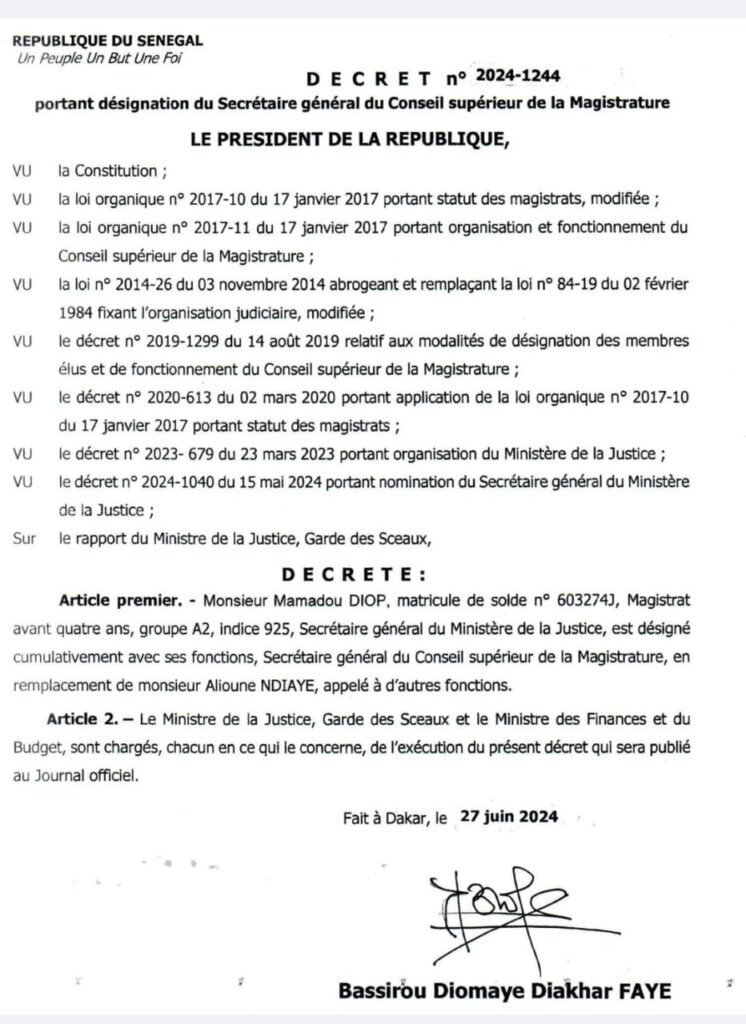 À travers un décret daté du 27 juin, le chef de l’État, Bassirou Diomaye Faye, par ailleurs président du CSM, a désigné le magistrat Mamadou Diop, actuel secrétaire général du ministère de la Justice, cumulativement avec ses fonctions, secrétaire général du Conseil supérieur de la magistrature.