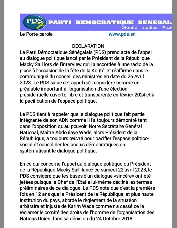 Dans le communiqué ci-dessous rendu public le vendredi 28 avril 2023 le parti démocratique sénégalais (PDS) se montre disponible. Me Abdoulaye Wade et ses camarades rappellent leur culture de dialogue qui a toujours marqué sa trajectoire politique.