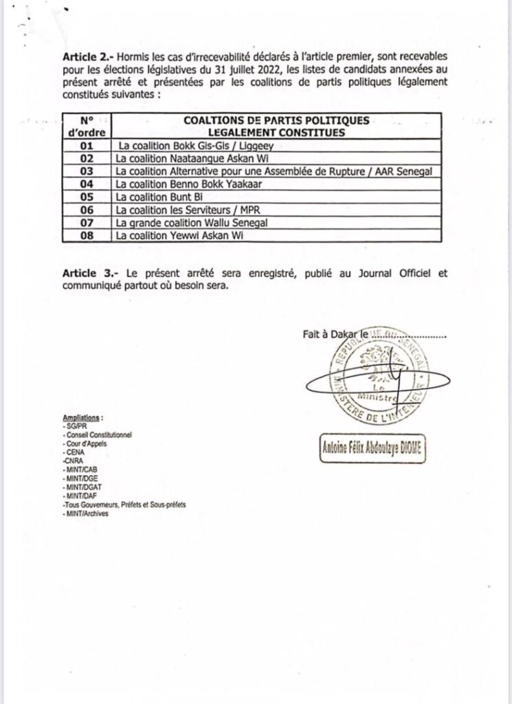 Selon l’arrêté du ministre de l’Intérieur rendu public, lundi, ont été déclarées recevables la coalition Bokk Gis Gis/Liggey, la coalition Naataange askan wi, la coalition Alternative pour une assemblée de rupture, la coalition BBY, la coalition Buntu Bi, la coalition Les Serviteurs, la grande coalition Wallu Sénégal, la coalition Yewwi askan wi.
