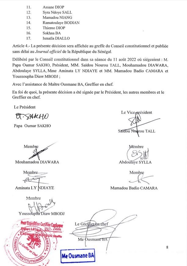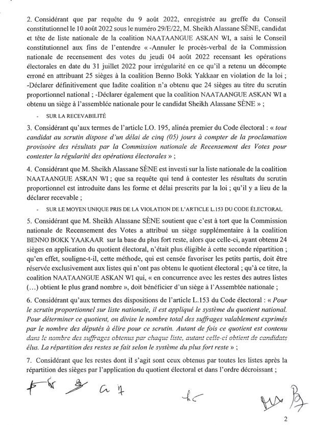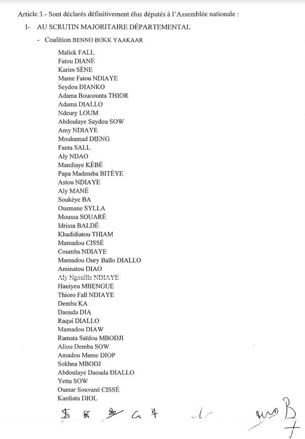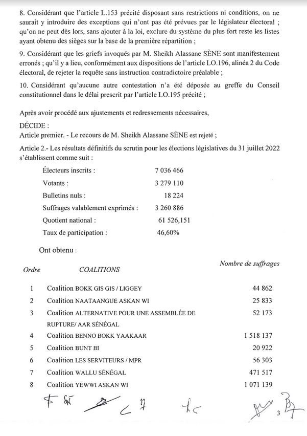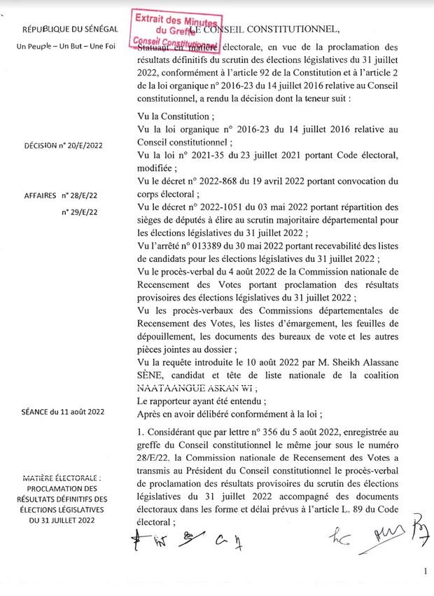 Le Conseil Constitutionnel a publié ce jeudi les résultats définitifs des élections législatives du 31 juillet 2022. Les résultats provisoires ont été confirmés. L’inter-coalition Yewwi-Wallu a renoncé à l’introduction d’un recours, malgré ses griefs, par manque de confiance à la juridiction. Par ailleurs, Cheikh Alassane Sène a été le seul à avoir introduit un recours qui a été rejeté. Le document, ci-dessous.