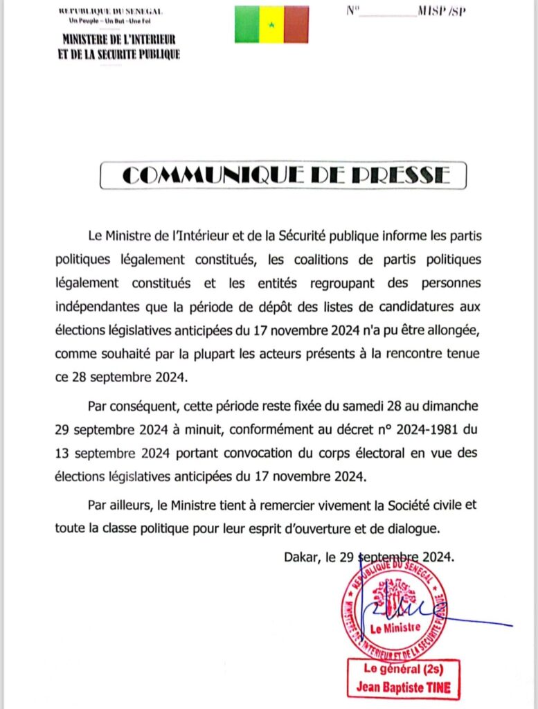 «Le ministre de l’Intérieur et de la Sécurité publique informe les partis politiques légalement constitués, les coalitions de partis politiques légalement constitués et les entités regroupant des personnes indépendantes que la période de dépôt des listes de candidatures aux élections législatives anticipées du 17 novembre 2024 n’a pu être allongée, comme souhaité par la plupart les acteurs présents à la rencontre tenue ce 28 septembre 2024 », a-t-on informé dans un communiqué qu’il a lui-même signé, ce jour.