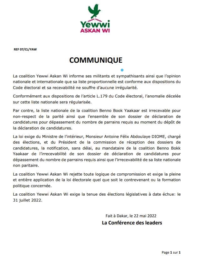 Dans un communiqué, la coalition Yewwi ne veut d’aucune compromission. Ousmane Sonko et ses camarades ne veulent pas non plus d’un report des élections. Le texte souligne persiste que la liste de Benno bokk yakaar est “irrecevable”. Yewwi exige que le ministre de l’Intérieur doit notifier sans délai la décision à Benno.