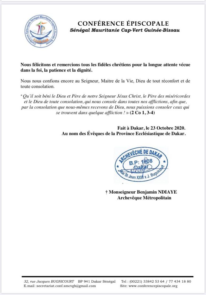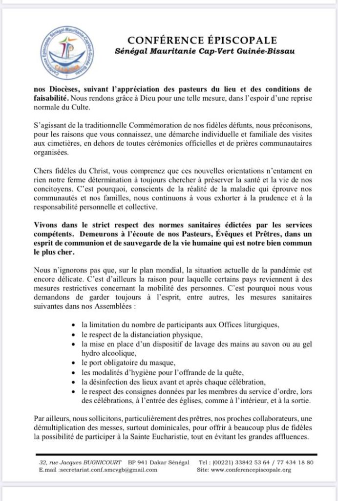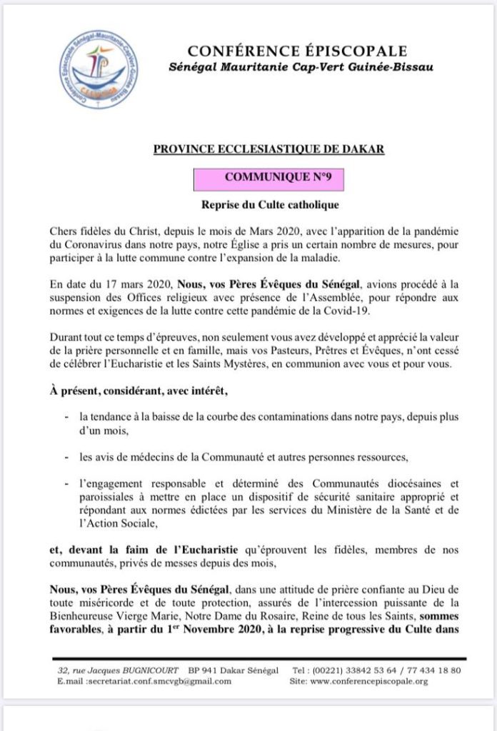 Au cours d’une déclaration, l’archevêque de Dakar a annoncé, au nom de la conférence épiscopale, la reprise progressive des célébrations liturgiques à partir de ce 1er novembre 2020. Cf. documents.