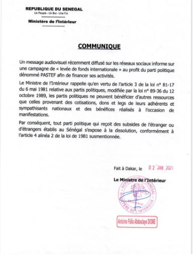 Ousmane Sonko devrait surveiller ses arrières. Sa collecte d’argent venant de l’étranger et même d’étrangers vivant au Sénégal pour financer des activités politiques est illégale. C’est du moins ce qu’a déclaré dans un communiqué le ministre de l’Intérieur qui menace de dissoudre le Pastef/Les Patriotes, si cette activité de levée de fonds internationale lancée hier persiste.