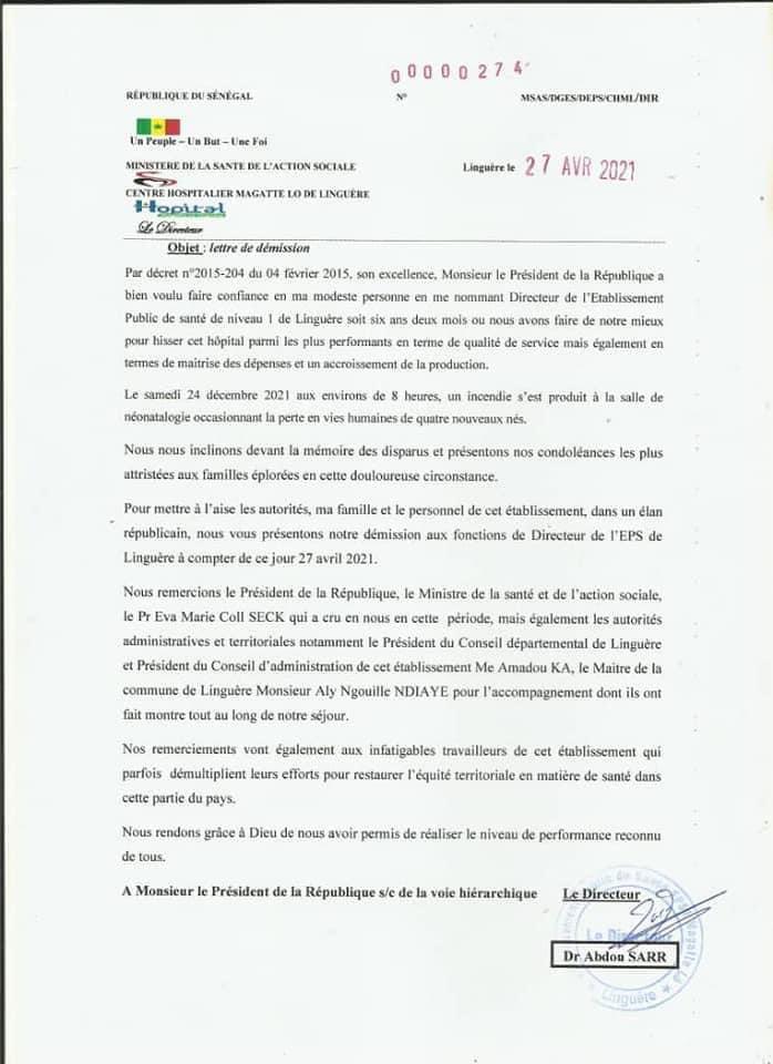 Le Directeur de l’hôpital Maguette Lô de Linguère a perdu son Directeur. Il vient d’adresser sa lettre de démission après l’incendie qui a tué six enfants dont quatre dans la salle de néonatologie et deux à Touba où ils ont été évacués. Lire le document.