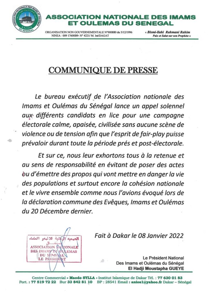 Le bureau exécutif de l’association des imams et oulémas du Sénégal appelle les différents candidats en lice pour une campagne électorale calme, apaisée, civilisée sans aucune scène de violence ou de tension afin que l’esprit de fair-play puisse prévaloir durant toute la campagne pré et post électorale…