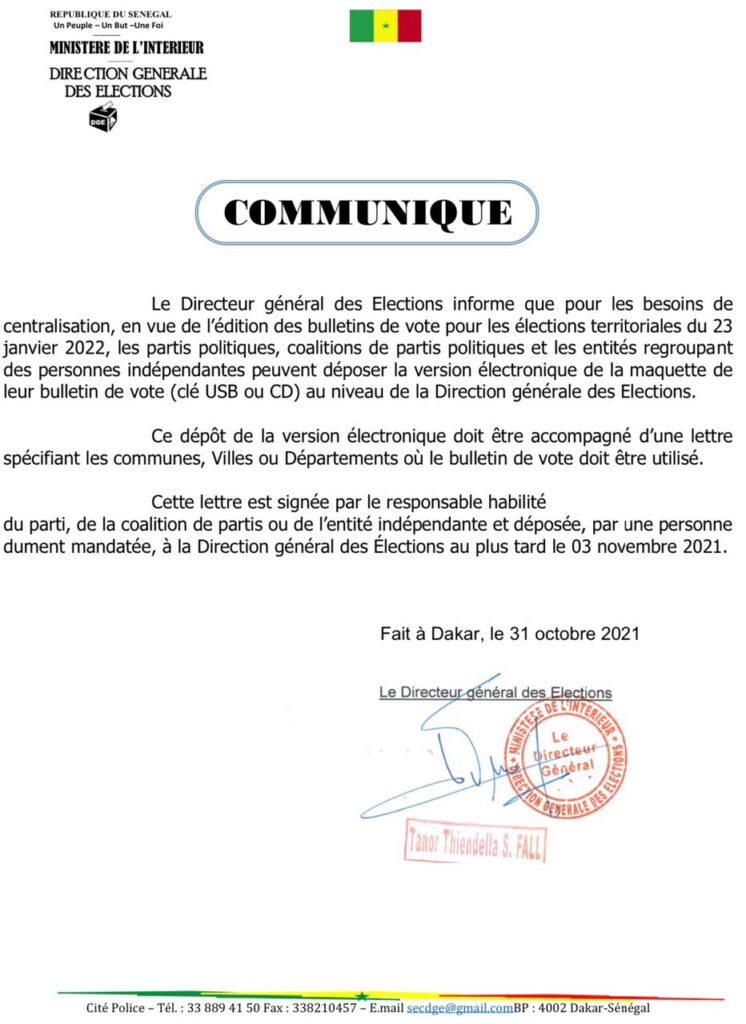 Les choses avancent à grands pas en perspectives des élections locales prévues le 23 janvier 2022. A ce propos, le directeur général des élections informe que pour les besoins de la centralisation, en vue de l’édition des bulletins de vote pour les élections locales et territoriales du 23 janvier 2022, les partis, coalitions de partis politiques et les entités regroupant des personnes indépendantes peuvent déposer la version électronique de la maquette de leur bulletin de vote (clé Usb ou Cd) au niveau de la Direction générale des élections…