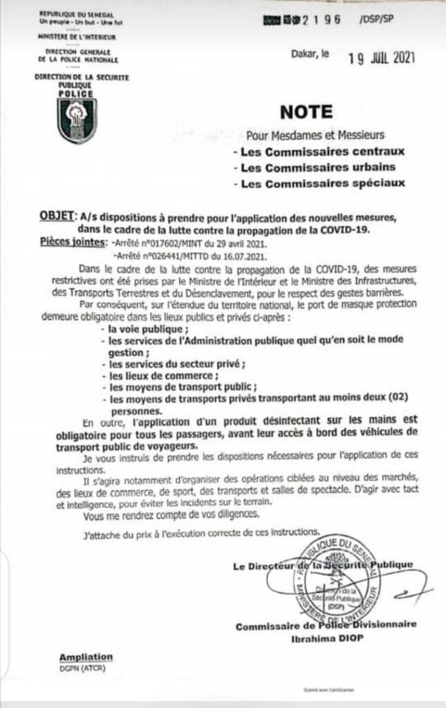 “Je vous instruis de prendre les dispositions nécessaires pour l’application de ces mesures. Il s’agit notamment d’organiser des opérations ciblées au niveau des marchés, des lieux de commerce, de sport, des transports et salles de spectacle, d’agir avec tact et intelligence pour éviter les incidents sur le terrain”, a recommandé le commissaire de police divisionnaire Ibrahima Diop..