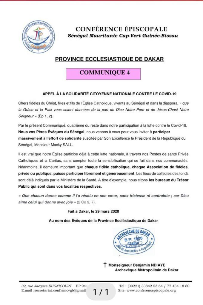 Les évêques du Sénégal, de la Mauritanie, du Cap-Vert et de la Guinée-Bissau appellent les fidèles à mettre la main à la poche dans le cadre de la lutte contre le covid-19.