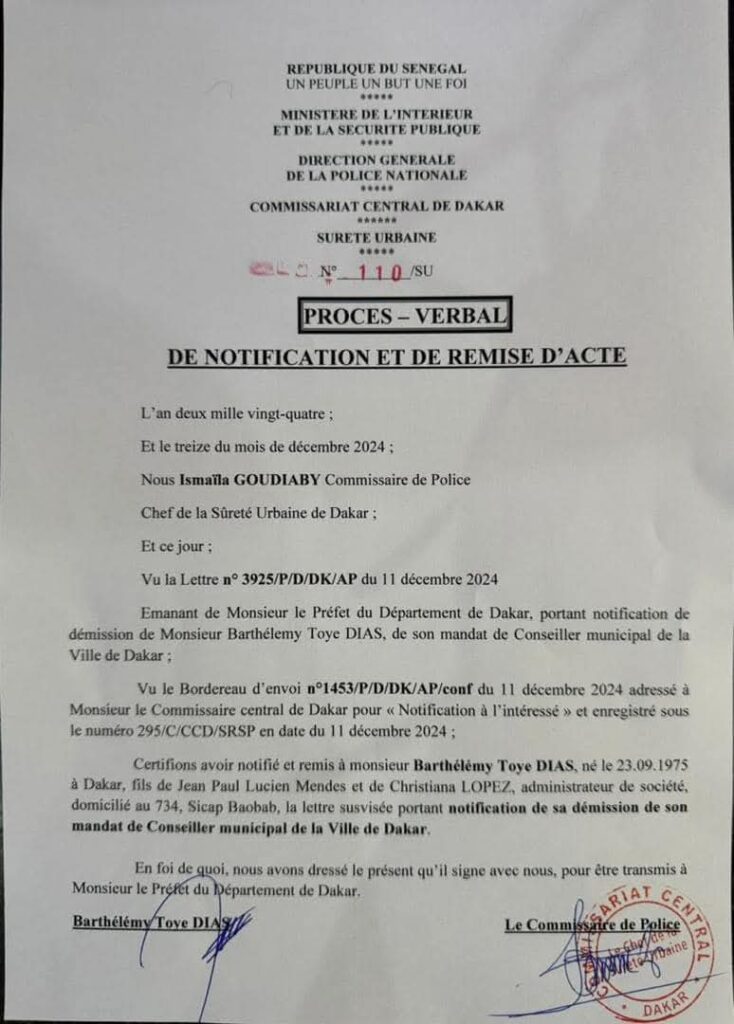 « […] Conformément aux dispositions des articles du code électoral portés en première référence, je vous déclare démissionnaire de votre mandat de conseiller municipal de la ville de Dakar à compter de la date de notification de la présente », a écrit le préfet de Dakar dans une note dont nous avons reçu copie.