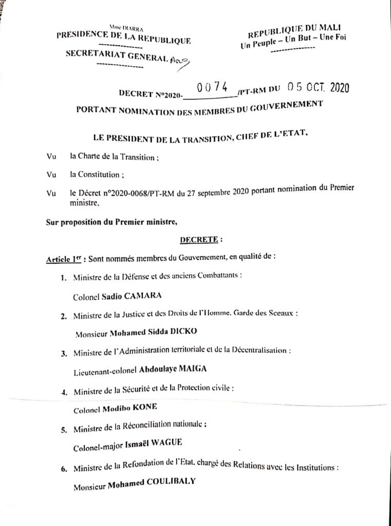 Le colonel Sadio Camara, un des dirigeants de la junte, devient ministre de la Défense. Il a notamment été directeur du Prytanée militaire de Kati, en périphérie de Bamako, où est situé le camp militaire d’où est parti le coup d’État. Parmi les ministères régaliens, l’ancien procureur Mohamed Sidda Dicko est nommé à la Justice.