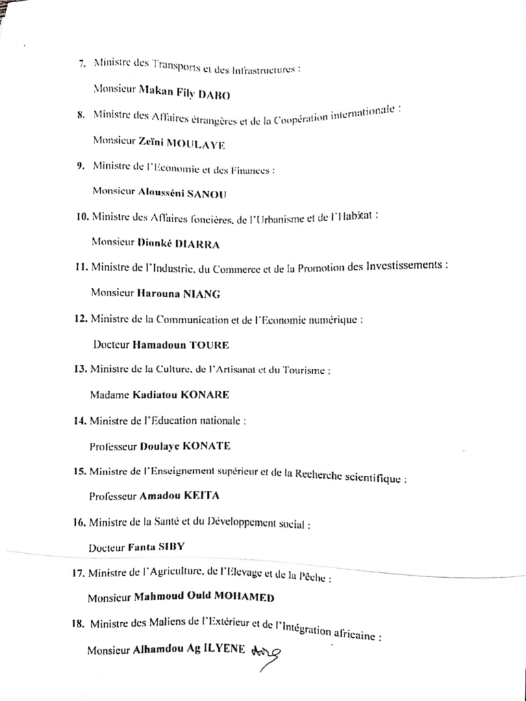 Le porte-parole de la junte, le colonel-major Ismaël Wagué, qui avait annoncé en pleine nuit à la télévision la prise du pouvoir par l’armée, obtient le portefeuille de la Réconciliation nationale.