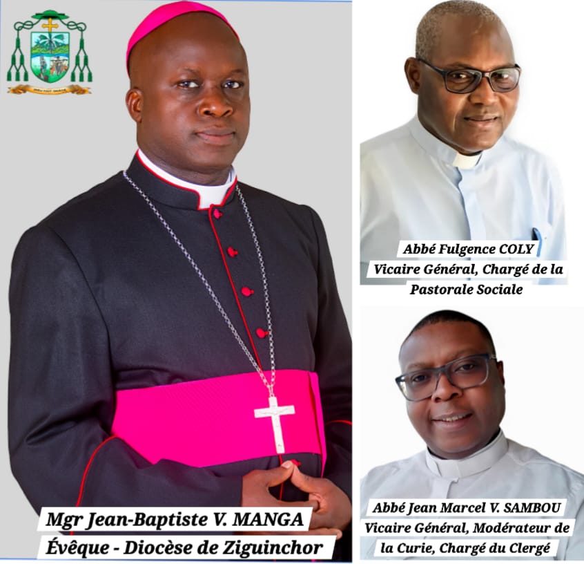 Ce dimanche 24 novembre 2024, en la Solennité du Christ Roi de l’Univers, le diocèse de Ziguinchor a vécu un moment solennel et fondateur. Au terme de la messe de prise de possession canonique, Son Excellence Mgr Jean-Baptiste Valter Manga, cinquième évêque du diocèse, a officiellement annoncé la nomination de deux Vicaires Généraux : l’abbé Fulgence Coly et l’abbé Jean Marcel Sambou.