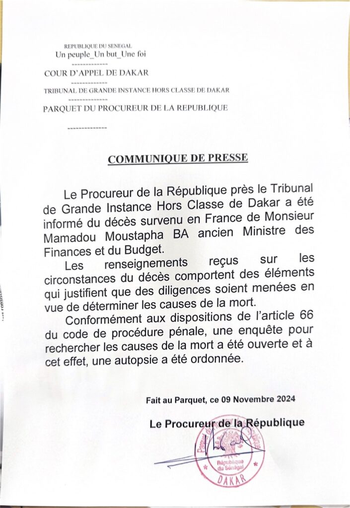 Dans un communiqué, le procureur du Tribunal de grande instance hors classe de Dakar demande l’ouverture d’une enquête sur la mort de Mamadou Moustapha Ba, ancien ministre des Finances et du Budget.