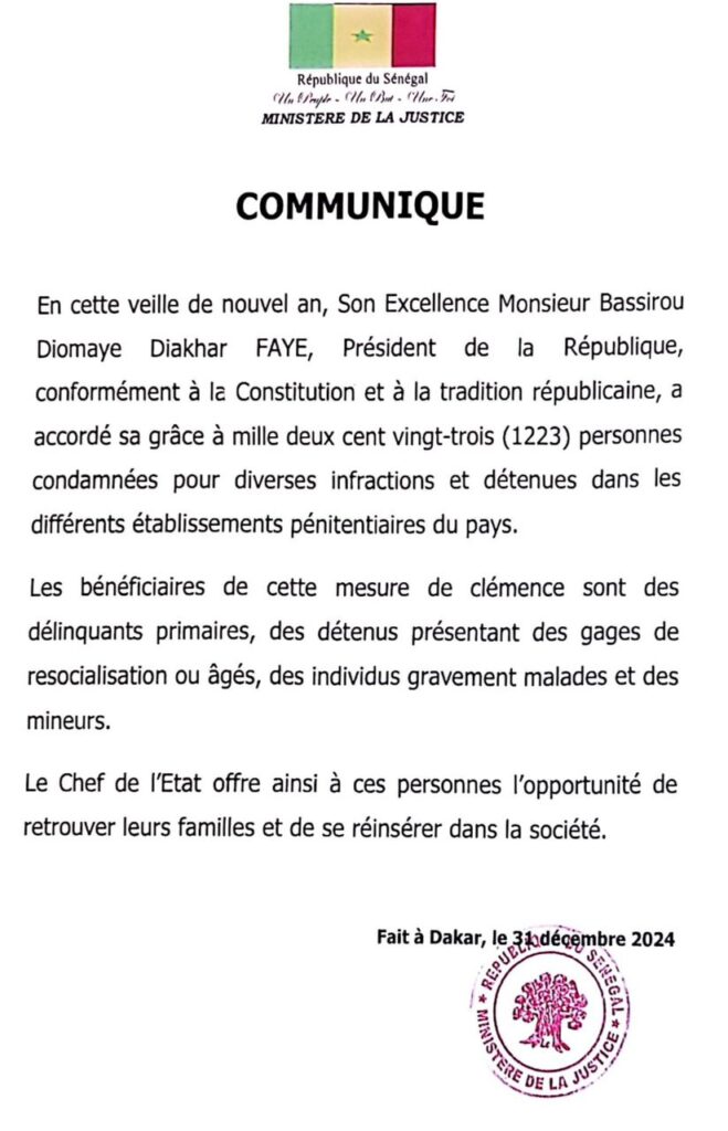 Actualités Société Nouvel an : le Président Bassirou Diomaye Faye accorde sa grâce à 1223 détenus (document) 31 décembre 202431 décembre 2024 jotalixibar Partager l'article Partager : Cliquer pour partager sur X(ouvre dans une nouvelle fenêtre) X Cliquez pour partager sur Facebook(ouvre dans une nouvelle fenêtre) Facebook Cliquez pour partager sur WhatsApp(ouvre dans une nouvelle fenêtre) WhatsApp Share Facebook Twitter Pinterest Linkedin