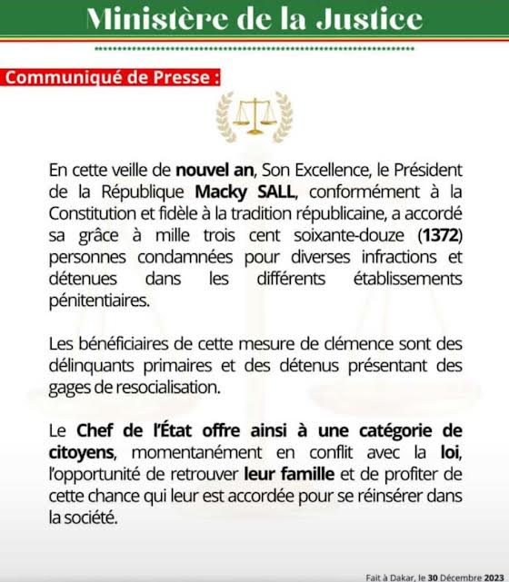 “En ce nouvel an, Son Excellence, le président de la République, Macky Sall, conformément à la Constitution, et fidèle à la tradition républicaine, a accordé sa grâce à 1372 personnes condamnées pour diverses infractions et détenues dans les différents établissements pénitentiaires”, peut-on lire dans un texte émanant des services du ministère de la Justice.