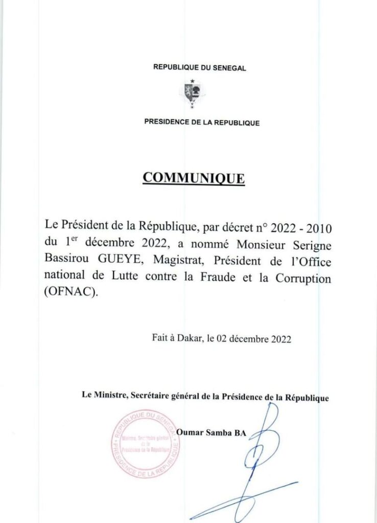 Dans un décret ci-dessous rendu public, le président Macky Sall à nommé Serigne Bassirou Guèye à la tête de l’Office national de lutte contre la corruption et la concuscion (OFNAC).