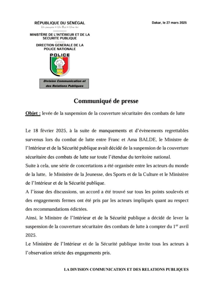 ”Le Ministre de l’Intérieur et de la Sécurité publique a décidé de lever la suspension de la couverture sécuritaire des combats de lutte à compter du 1ᵉʳ avril 2025”, peut-on lire dans un communiqué signé le 27 mars 2025.
