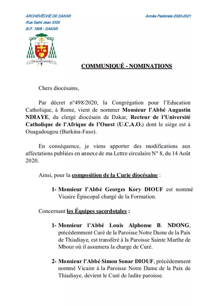 Le communiqué rendu public ce jeudi 20 août 2020 par l’archevêque de Dakar précise que l’Abbé Augustin Ndiaye, Docteur en Droit Canonique, était jusqu’à sa nomination le Curé de la paroisse de Sainte Marthe de Mbour. Ancien Curé de la Cathédrale Notre Dame des Victoires de Dakar, il a été non seulement pendant de nombreuses années le Recteur du Grand Séminaire interdiocésain François Liberman de Sébikotane, mais encore, il été Président du Tribunal Ecclésiastique interdiocésain de Thiès et de l’Union du Clergé Sénégalais (UCS).