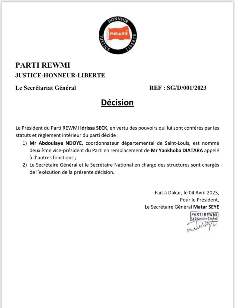 Idrissa Seck n’en a visiblement pas fini avec Yankhoba Diattara. Après l’avoir humilié en.pleine réunion de secrétariat national lui reprochant de n’avoir pas recruté 50 jeunes “rexmistes” dans son ministère, Idrissa Seck a limogé Diattara de son poste au sein de son parti.