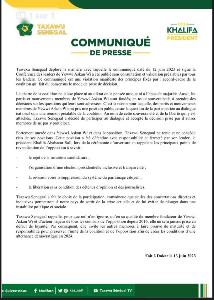 Dans le communiqué ci-dessous dont Jotalixibar a reçu copie, la coalition Taxawu Sénégal de Khalifa Sall recadre Sonko et ses amis. Ces derniers ont sortis hier pour le mettre en garde. Ils dénoncent le.ton du communiqué.