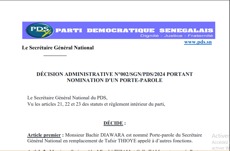 Le Secrétaire général du Parti démocratique sénégalais (PDS), Abdoulaye Wade, a procédé à un changement à la tête du porte-parolat. Il remplace Tafsir Thioye. C’est désormais, l’ancien chef de cabinet de Karim Wade qui est en en place. Gallo Tall et Abo Mbacké Thiam sont nommés porte-parole adjoints.