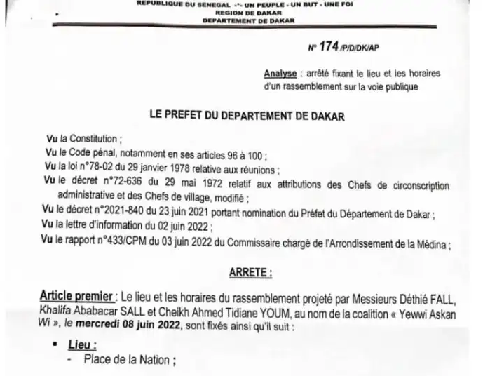 Par arrêté préfectoral, la manifestation de la coalition Yewwi askan wi a été autorisée. Elle se déroulera à la Place de la Nation, ex-Obélisque, de 15 heures à 19 heures. L’opposition conteste le rejet de la liste proportionnelle de ses titulaires.