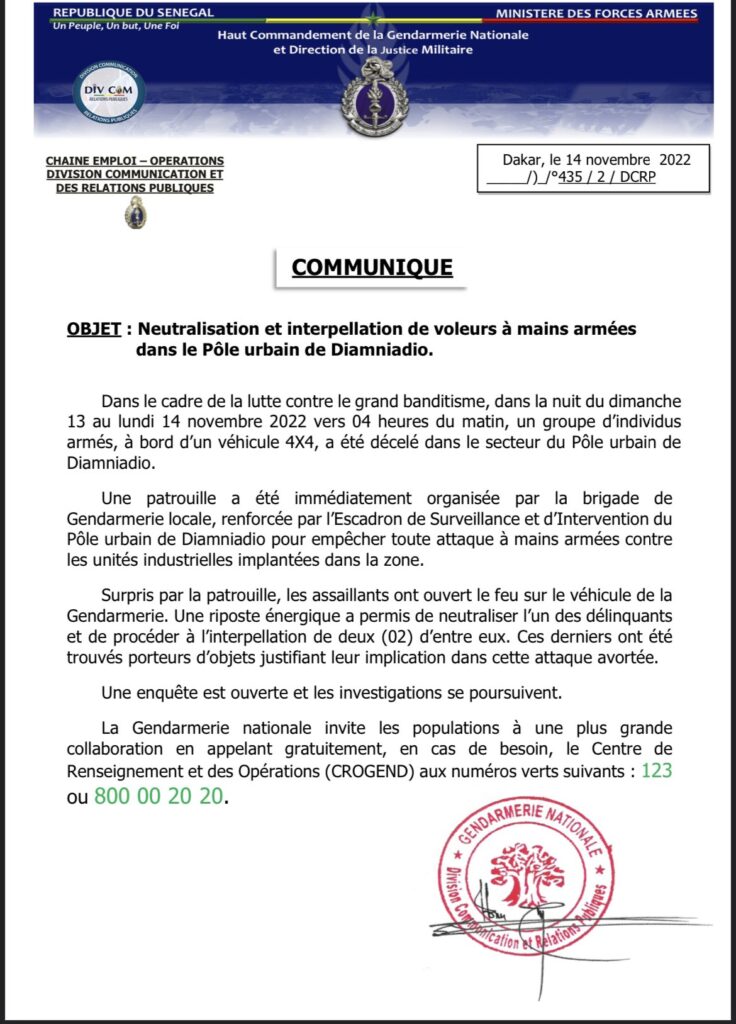 Dans un communiqué dont Jotalixibar a reçu copie, la Gendarmerie a informé de la neutralisation de voleurs armés u niveau du pôle de Diamniadio.