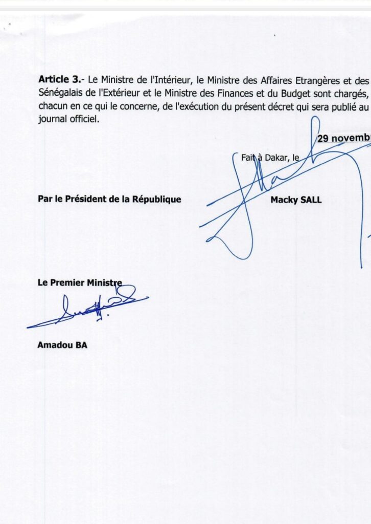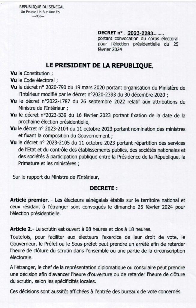 Le ministre de l’Intérieur Sidiki Kaba a rendu publique le projet de décret portant convocation du corps électoral. Selon le document signé le 29 novembre dernier, « les électeurs sénégalais établis sur le territoire national et ceux résidant à l’étranger sont convoqués le dimanche 25 février 2024 pour l’élection présidentielle. Et que le scrutin est ouvert à 08 heures et clos à 18 heures ». Le Gouverneur, le Préfet ou le Sous-préfet peut prendre un arrêté afin de retarder I’ heure de clôture du scrutin dans l’ensemble ou une partie de la circonscription électorale ». Il fait savoir que le chef de la représentation diplomatique ou consulaire « peut prendre une décision afin d’avancer l’heure d’ouverture ou de retarder l’heure de clôture du scrutin, selon les spécificités locales.